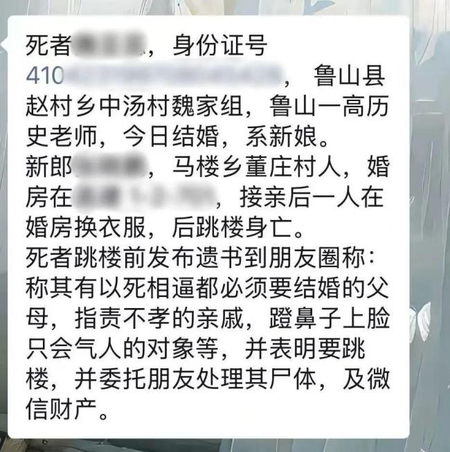 两天后,鲁山县殡仪馆接收了一名28岁高中女教师的遗体。工作人员确认,这名女性是在新婚当日坠楼,次日才被送到殡仪馆。一条年轻的生命就这样在最喜庆的日子里戛然而止。
