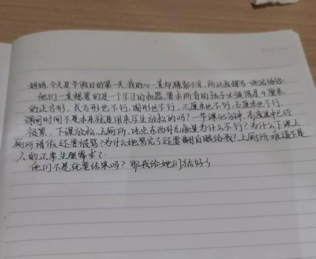 “妈妈,今天是节假日的第一天,我的心一直躁郁不安,所以我想写一些话给你:他们一直想要的是一个学习的机器,要求所有的孩子必须得是4厘米的正方形,长方形也不行,圆形也不行,三厘米也不行,五厘米也不行。课间时间不是本来就用来学生放松的吗?一节课45分钟,高度集中已经很累,下课放松,上厕所,吃点东西补充能量为什么不行?为什么下课上厕所请假还要被骂?为什么她骂完了还要翻白眼给我?上厕所难道不是人的正常生理需求?他们不是就要结果吗?那我给他们就好了。”