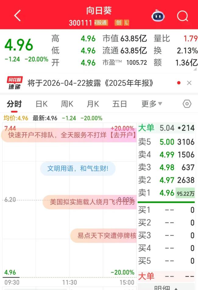 1月15日,向日葵(300111.SZ)开盘跌停。截至发稿前,该股报4.96元/股,市值为63.85亿元。