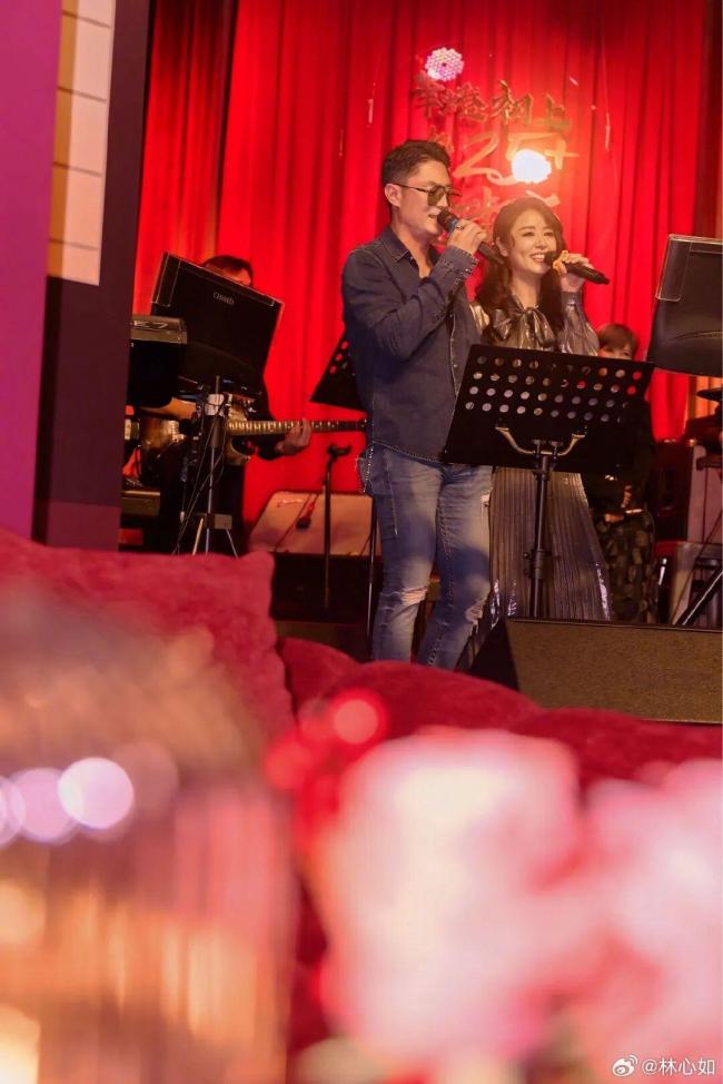 其中一张照片中,林心如和丈夫霍建华在台上合唱。林心如身穿银色大蝴蝶结百褶长裙,搭配复古波浪卷发和大红唇,显得气质优雅。霍建华则戴着墨镜,一身牛仔装扮。两人紧密相依,画面十分甜蜜。