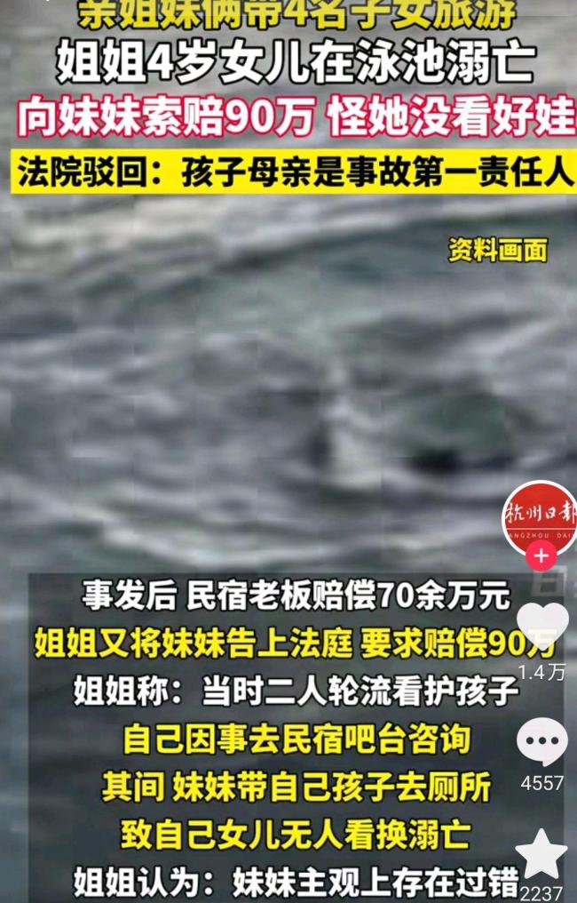 这件事引发了关于亲情与法律责任的讨论。有人指出,这场悲剧可能导致家庭关系破裂,甚至可能引发离婚。然而,这起事件的真实性有待考证。经过搜索发现,类似的事情发生在2024年左右,2025年1月有相关报道。浙江的陈女士和妹妹带四个孩子去游泳池玩。陈女士因事去吧台咨询,而妹妹则带着自己的孩子去了厕所。结果,陈女士的一个女儿无人看管,不幸溺亡。民宿老板赔偿了70万元。陈女士认为妹妹看护不力,将妹妹告上法庭,要求赔偿90万元,但法院并未支持。原因是陈女士当时并未明确委托妹妹看管,也未离开民宿大厅,不存在临时监护权转移。
