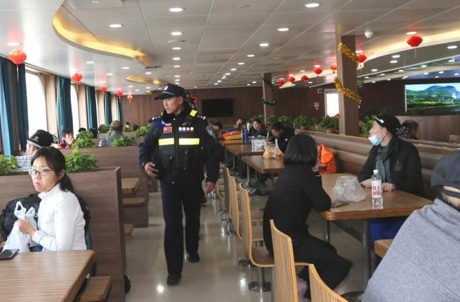 从5日下午到6日凌晨,烟台到大连往返的16个小时里,肖政强和同事们几乎没有休息时间。“乘警的工作很杂,安全宣传、巡逻防范、调解纠纷、应急处突,样样都得会”,他说,“船就是一个小社会”。