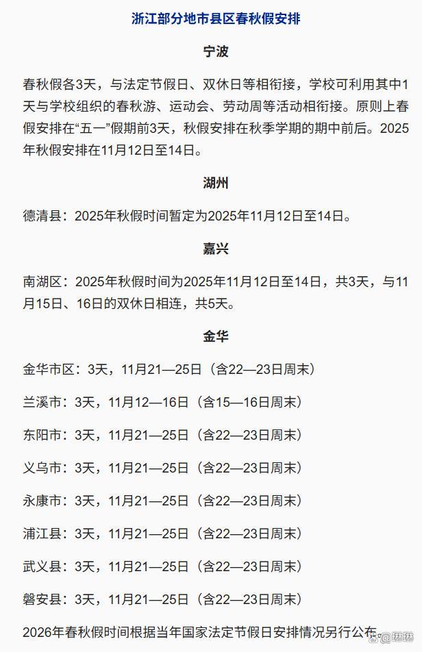 浙江省作为全国首个全省范围内推行春秋假的省份,自2025年秋季学期起开始实施。该省的春假安排在4月至5月之间,秋假则在11月,覆盖了超过600万名学生。许多地方的秋假与周末相连,形成了5天的小长假。