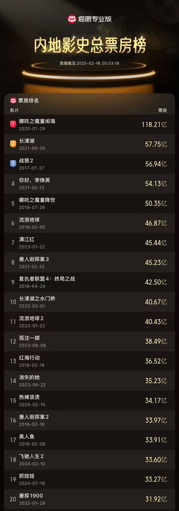 其中,《哪吒之魔童闹海》的国内票房已达118.8亿元,年度票房占比达59.4%。