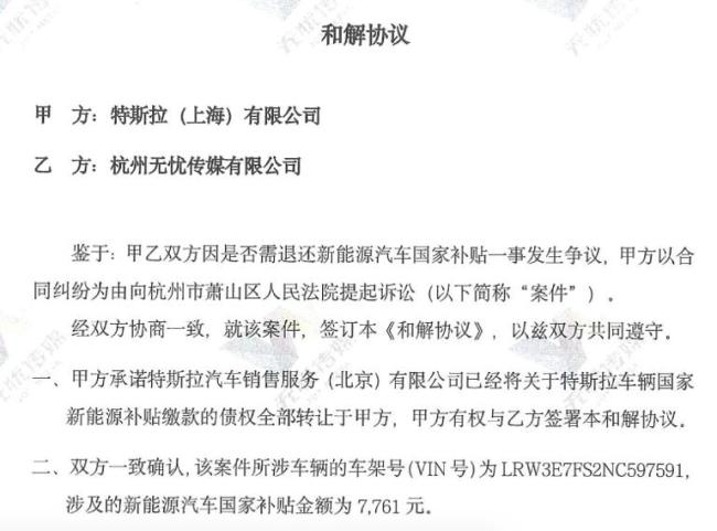 据了解,2022年无忧传媒购入一辆特斯拉,特斯拉垫付了7761元新能源补贴款,并要求车辆在两年内行驶里程达到2万公里。此后,由于车辆里程未达到要求,特斯拉无法获得国家补贴,因此要求退还7761元。无忧传媒表示,双方已就此事达成一致并正式签订《和解协议》,明确不再就相同事由另行提起诉讼,且无其他争议。根据和解协议,无忧传媒已在11月17日向特斯拉退付相关款项7761元,特斯拉将在2个工作日内提交撤诉申请。