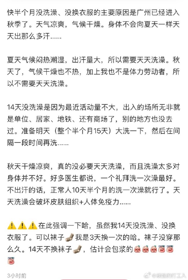 该网友声称因广州进入"秋季凉爽干燥"季节(11月中下旬),且自身活动量较小(仅居家、通勤),故14天未洗澡未换外衣,仅3天更换一次袜子。其引用"医生建议"称每周洗一次澡最佳,认为天天洗澡会破坏皮肤屏障。