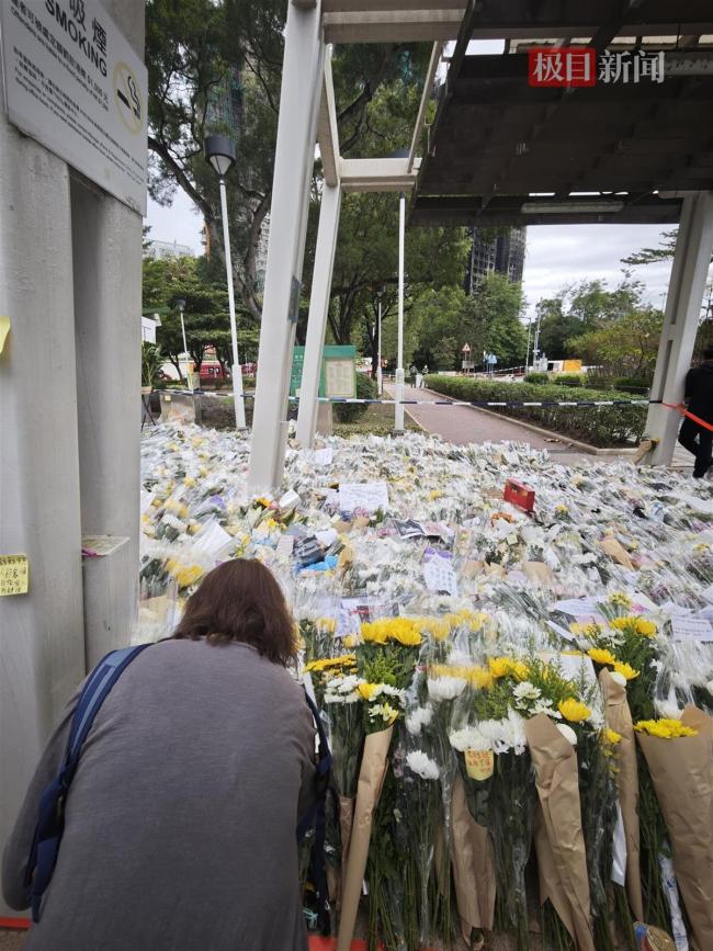 11月30日,在宏福苑设置的吊唁点,陆续有市民前来献花吊唁,献花队伍从吊唁点往附近大埔河边延伸,约有两三公里长。