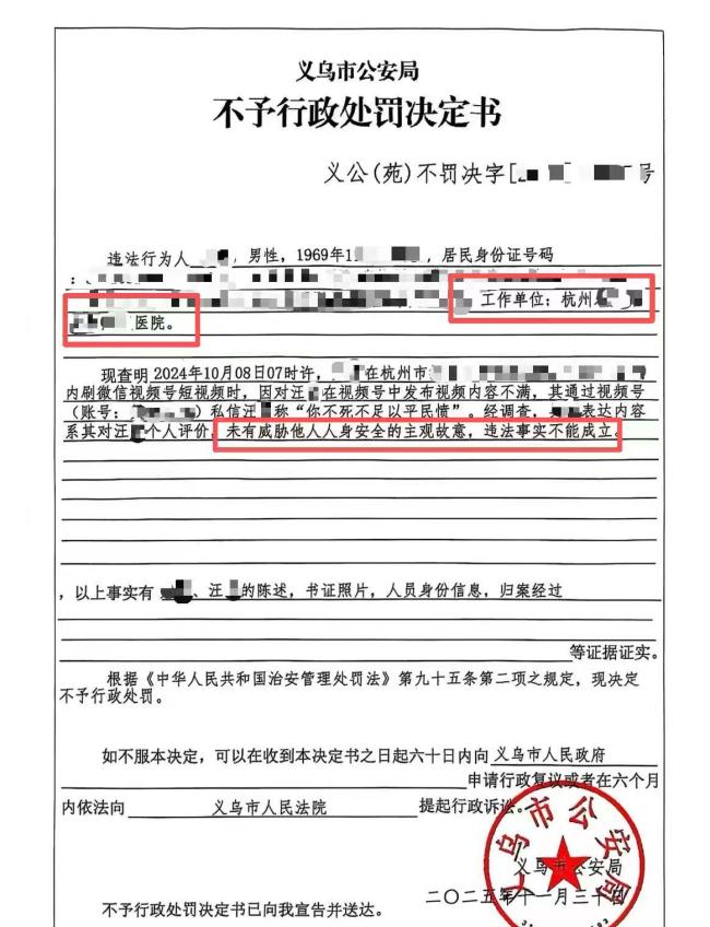 根据平台提供的信息,汪先生进一步查询到“涉事账号”号主的真实身份是杭州某医院的副主任医师。取得相关信息后,汪先生再次将材料提交给办案单位。2025年11月30日,义乌市公安局出具《不予行政处罚决定书》。决定书显示:涉事账号号主确实在杭州某医院工作,但未提及详细职务。对于该医生涉嫌私信威胁的情况,警方表示,其于2024年10月8日7时许在杭州家中刷视频时,因对汪先生发布的内容不满,通过私信发送了上述言论。警方认为,涉事账号号主表达的内容系其个人评价,“未有威胁他人人身安全的主观故意,违法事实不能成立”。
