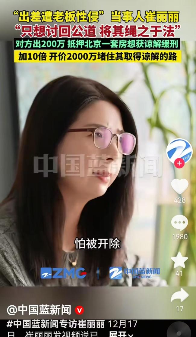 12月18日,崔丽丽接受了采访,讲述了她从老板王某试图用金钱私了到最终被判刑的全过程。最初,王某认罪并希望通过公司同事传话,提出给崔丽丽200万以获取谅解。他说自己刚买了房子,女儿在美国留学,家庭开销大,只能抵押房产来支付这笔钱。