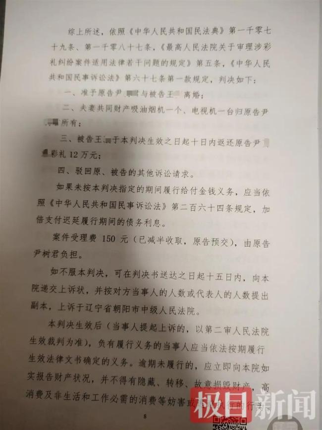 据尹先生提供的朝阳市双塔区人民法院民事判决书显示,法院依照相关法律规定,准予尹某某与王某离婚;夫妻共同财产吸油烟机一个、电视机一台归尹某某所有;被告王某需在判决生效之日起十日内返还尹某某彩礼12万元。判决时间为2025年1月6日。
