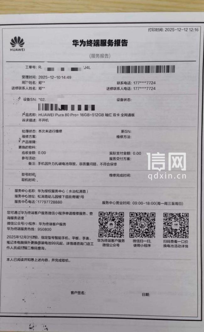 事发当天下午,郑先生带着损毁的手机前往安阳市殷都区华为授权服务中心进行检测。售后于12月12日出具报告,认定手机因外力扎破电池导致故障,不属于质量问题,不符合保修条件。售后解释说,可能是后壳碎裂扎破电池导致爆炸,或是手机从桌面摔落致玻璃后壳破碎划伤电池引发爆炸。