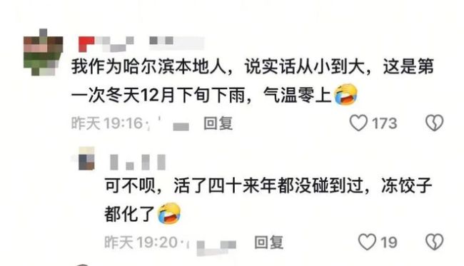 视频评论区中,不少网友对今年哈尔滨的天气感到罕见,一位本地网友提到,这是他从小到大第一次遇到12月下旬下雨且气温零上的情况。