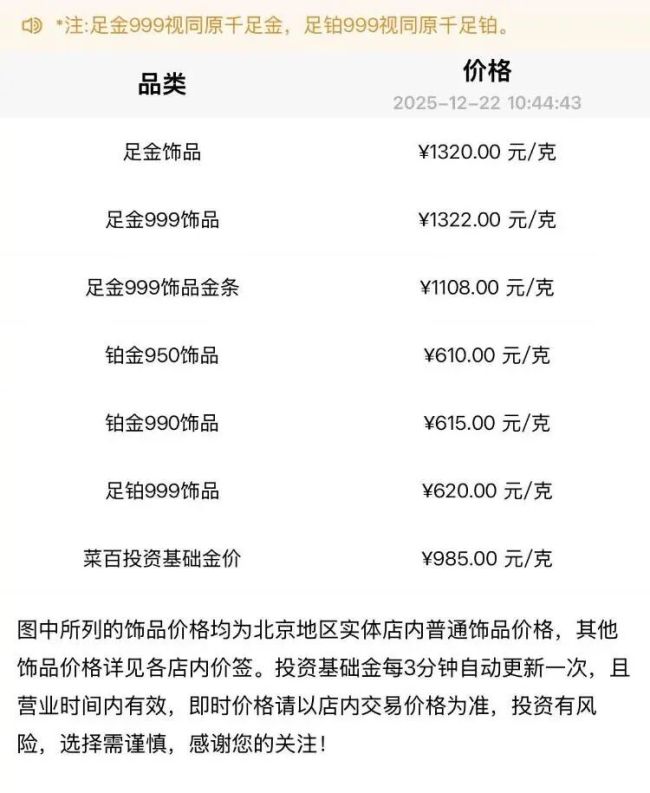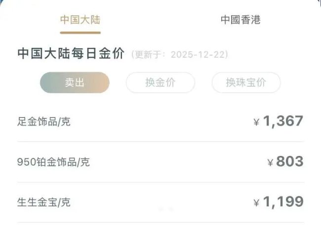 实物黄金方面,12月22日,周大福足金饰品报1368元/克,工艺金章金条类1199元/克;周生生足金饰品报1367元/克,生生金宝1199元/克;菜百首饰足金饰品报1320元/克,足金999饰品报1322元/克,足金999饰品金条报1108元/克。