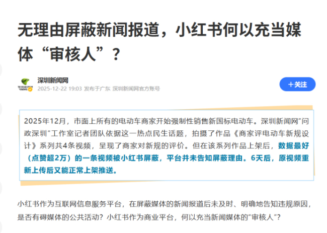 近日,深圳新闻网在多个平台上发声,质疑小红书平台无正当理由屏蔽其发布的一则关于电动车新规的新闻报道。深圳新闻网是深圳报业集团旗下正规新闻媒体,在小红书平台拥有“新闻媒体”官方认证,主要业务包括各类新闻的采集与编发,兼具新闻传播与公共监督职能。