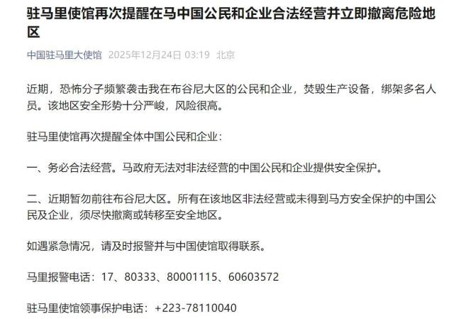 12月24日凌晨,中国驻马里大使馆发文提醒在马中国公民和企业合法经营并立即撤离危险地区。近期,恐怖分子频繁袭击布谷尼大区的中国公民和企业,焚毁生产设备,绑架多名人员,该地区的安全形势严峻,风险很高。