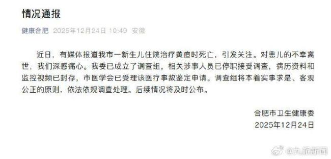 核心提示:12月24日,合肥市卫生健康委发布情况通报,对媒体报道的该市一新生儿住院治疗黄疸时死亡事件表示关注。通报称,已成立调查组,相关涉事人员已被停职接受调查,病历资料和监控视频已封存,市医学会也已受理医疗事故鉴定申请
