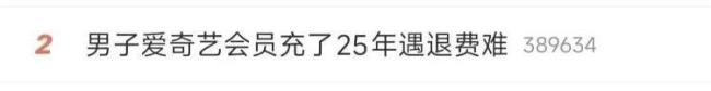 12月28日,“男子爱奇艺会员充了25年遇退费难”话题登上微博热搜。12月25日,河南许昌的黄先生称自己在爱奇艺会员上充了25年的费用,现在想退费却遇到了难题。他表示之前一直是家人在使用,最近他开始看剧才发现会员从2017年充到了2043年。“再怎么喜欢爱奇艺也不可能充20多年会员,房贷才30年。”