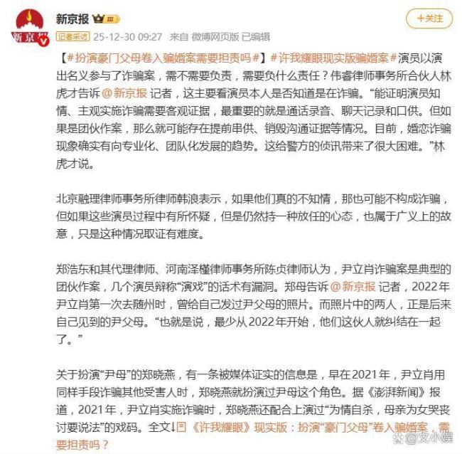 受害方透露,这场骗局早有前科。2022年,尹某某首次拜访郑家时就发送过“假父母”的照片进行铺垫。扮演“尹母”的另一位演员郑晓燕更是经验丰富,早在2021年就用同样手法配合尹某某诈骗另一名男子,甚至上演了“为女自杀讨说法”的苦情戏码。如此熟练的操作让人怀疑,参与其中的职业演员是否真的毫无察觉。