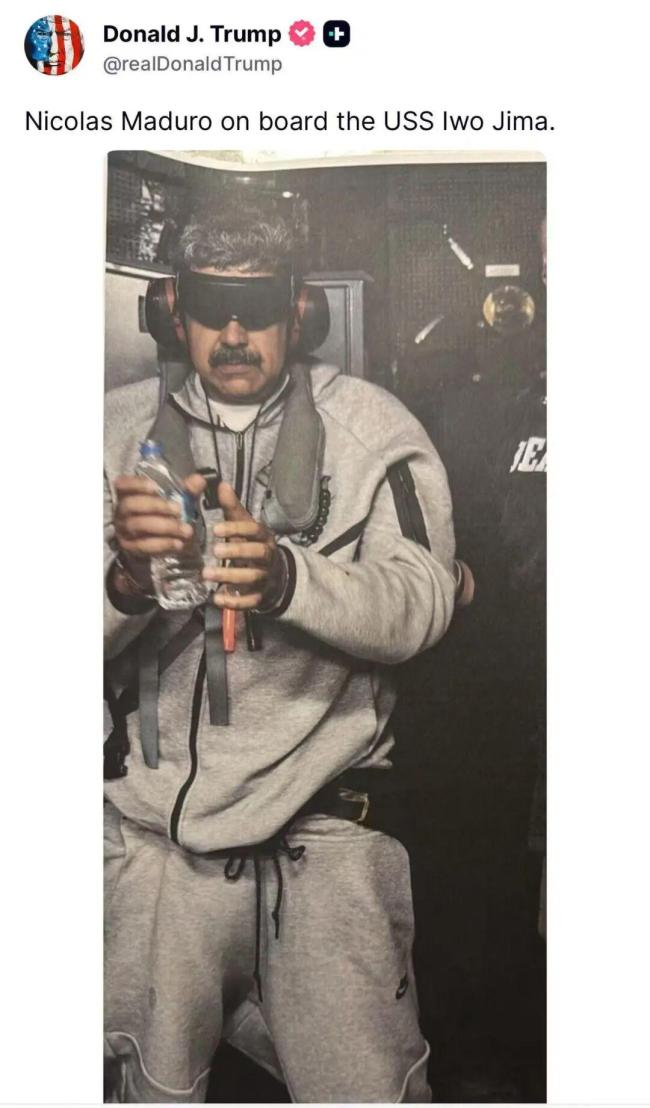 美国总统特朗普在社交媒体上发布了一张照片,显示委内瑞拉总统马杜罗在美国军舰上戴着手铐,双眼被黑布蒙住。联合国秘书长对此表示震惊。最新消息指出,马杜罗正被送往纽约。中方对美方使用武力并对一国总统采取行动深表震惊,并予以强烈谴责。