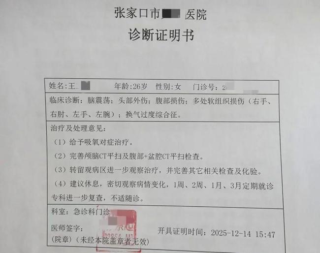 王女士因被拖拽、殴打和恐吓,身体不适,当即报警并联系120。事发当日,她和婆婆一起被送到医院就诊,之后独自留在医院无人照看。医院诊断证明显示,王女士被诊断为脑震荡、头部外伤、腹部损伤,多处软组织挫伤及换气过度综合征。近日,王女士已做伤情鉴定,结果待出。
