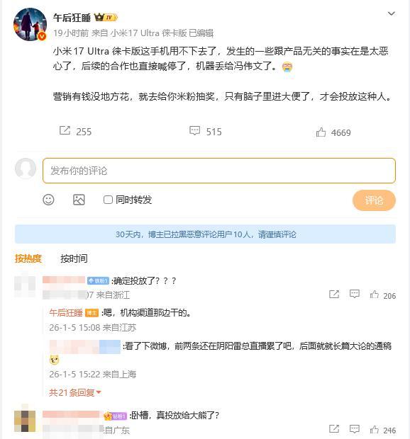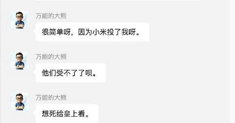 有网友指出,支持小米与其他博主投放商业合作,但不能选择每天抹黑小米的意见领袖。还有人发布了截图显示,“万能的大熊”曾在回复中称,“小米不会死,死的是米粉”。此外,有博主因不满宣布中止与小米的合作并归还产品。这位博主还披露了一张聊天记录截图,其中“万能的大熊”表示,“很简单,因为小米投了我呀。他们受不了。”