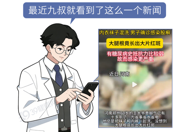 郑州60岁的王大爷患脚气多年,因贪图方便长期将袜子与内裤混洗。结果,真菌交叉感染导致大腿根部出现大片严重红斑,着实把自己吓了一跳。他前往医院就诊,最终被诊断为股癣,由于他还患有糖尿病,抵抗力较弱,所以感染更加严重。
