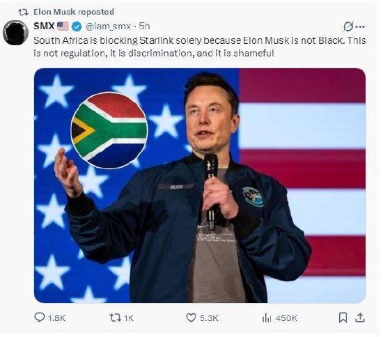 马斯克提到,南非目前的反白人法律比种族隔离时期的反黑人法律还多。他坚决反对任何形式的种族歧视,呼吁建立一个公平、公正的竞争环境。他还转发了一条美国新闻网站SMX的帖子,该帖子批评南非屏蔽星链是基于对马斯克种族背景的歧视。