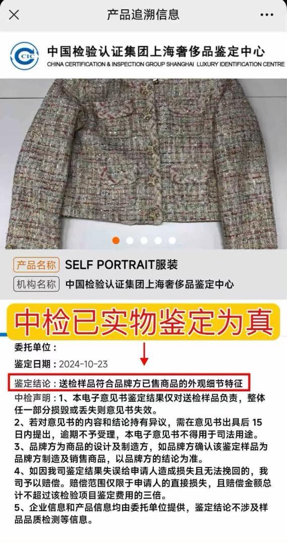 得物方面表示,涉案外套经过多个第三方鉴定机构和鉴别师的鉴定,结果均为正品。该外套与国内专柜版本存在细节上的差异,主要是因为平台卖家出售的是海外版本。得物还展示了中检鉴定中心的鉴定意见书,证明送检样品符合品牌方已售商品的外观细节特征。但该意见书明确指出,不得用于司法用途,且以品牌方结论为准。