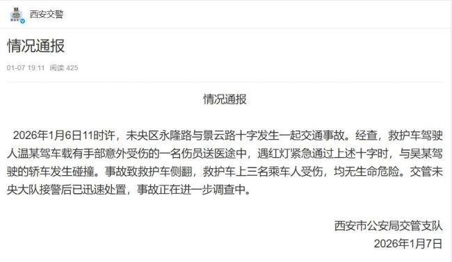 陕西省西安市公安局交管支队发布通报,2026年1月6日11时许,未央区永隆路与景云路十字发生一起交通事故。救护车驾驶人温某在送手部意外受伤的伤员就医途中,遇红灯紧急通过该十字路口时,与吴某驾驶的轿车发生碰撞。事故导致救护车侧翻,救护车上三名乘车人受伤,但均无生命危险。交管未央大队接警后迅速处置,事故正在进一步调查中。