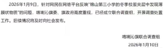 据新京报报道,喀喇沁旗教育局相关负责人表示,正与市监部门在学校进行调研。视频显示的是冬季校服,校服布料有质检报告,这种膜可能是用于保暖,具体情况还在进一步调查中。