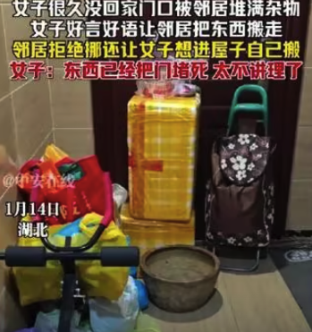 1月14日,湖北。女子很久没回家门口被邻居堆满杂物,女子好言好语让邻居把东西搬走,邻居拒绝挪还让女子想进屋子自己搬,女子:东西已经把门堵死,太不讲理了,物业也不管。