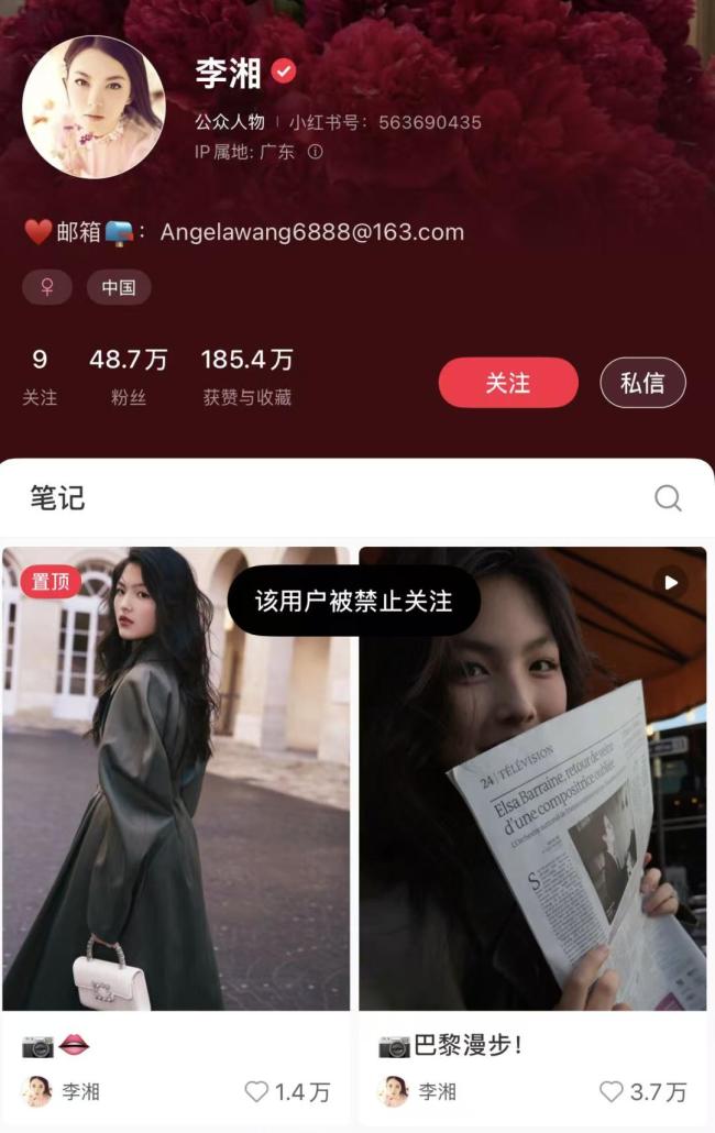 1月16日,知名主持人李湘的微博、抖音和小红书账号同步显示“被禁止关注”状态。微博平台明确提示,该用户因违反法律法规或社区公约被限制关注。