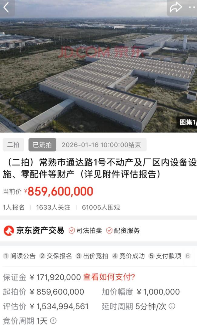 观致汽车常熟工厂第一次拍卖于2025年12月底进行,当时起拍价约为10.75亿元,最终流拍。第二次拍卖起拍价相较第一次已经打了八折。观致汽车厂再流拍 6万人围观1人报名 二次拍卖仍无人出价!