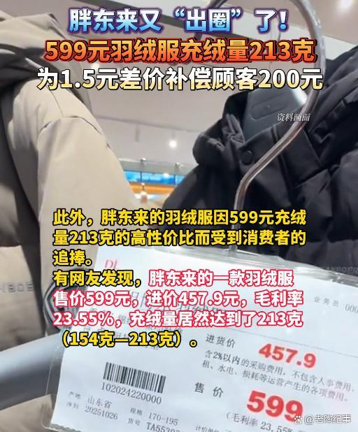 1月16日,胖东来599元羽绒服充绒量213克的信息冲上了热搜。没有明星八卦,没有网红炒作,只是一串朴实无华的数字:价格599元,大码充绒量213克,绒子含量90%以上。