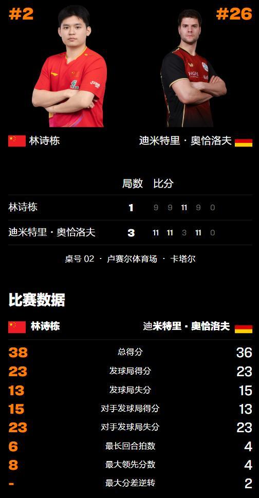 比赛开始后,林诗栋开局不利,进攻积极性不如对手,很快落后。尽管他多次追平比分,但最终还是以9-11惜败首局。第二局奥恰洛夫先赢4分后被追回3球,随后用掉了暂停机会。重返赛场后,林诗栋未能找回状态,以9-11再负一局。