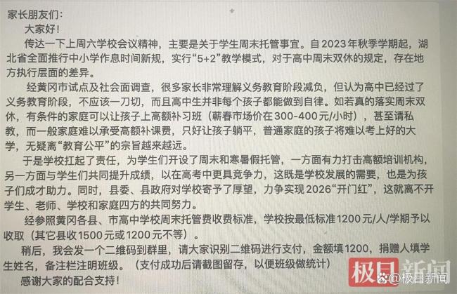 在一名家长提供的家长群消息中,学校表示为学生开设周末和寒暑假托管服务,目的是打击高额培训机构,同时提升学生成绩。学校参照黄冈其他学校的收费标准,决定按每学期1200元的标准收取费用,并要求家长识别二维码支付,金额1200元,捐赠人填写学生姓名。