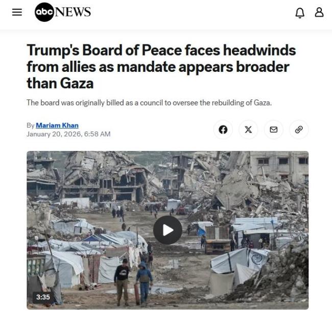 所谓“和平委员会”,原本是美国白宫去年9月发布的关于加沙停火与战后安排的“20点计划”中的一项内容,即成立“和平委员会”监督加沙地带战后过渡治理。这个委员会从一开始就备受质疑,很多分析认为,美方是在借此控制加沙地带。但现实进展证明,美方的野心不仅限于加沙。