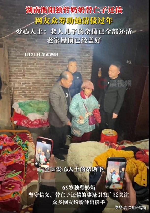 1月21日湖南衡阳。69岁独臂奶奶坚守信义、替亡子还债的事迹引发广泛关注,众多网友纷纷伸出援手。上周,在各地爱心人士的助力下,老人儿子的余债已全部还清,老家屋顶已经盖好,水电也装好。同时,大家还为奶奶捐赠了过年物资,用暖意守护这份可贵的诚信。