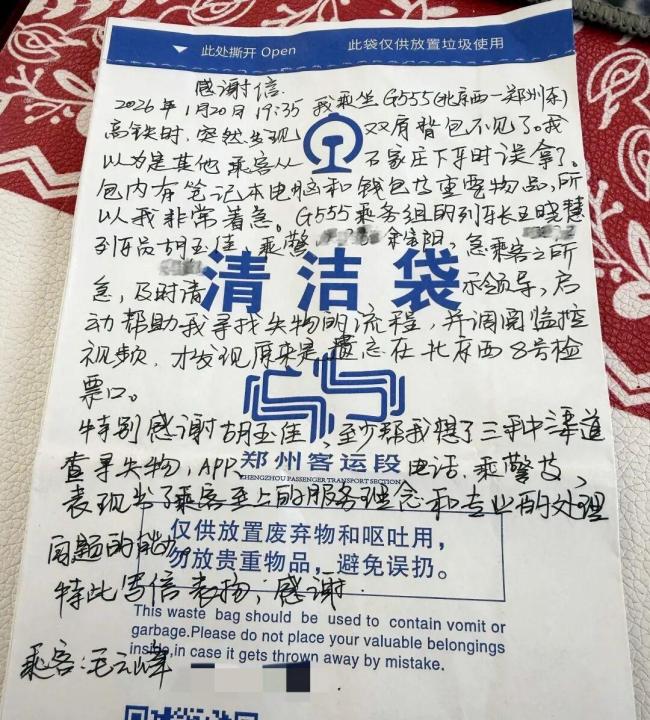 近日,中国铁路郑州局集团有限公司郑州客运段的乘务人员收到了一份特殊的高铁“漂流瓶”,这是一封写在清洁袋上的感谢信。
