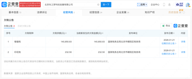 企查查APP显示,北京车之梦科技发展有限公司(曾用名:北京鲲飞科技发展有限公司)近日新增两则欠税公告,欠税余额总计超过14.1万元,涉及增值税和印花税两大税种。国家税务总局北京市朝阳区税务局依法发布了这些信息,并将其纳入公开公示范畴,接受社会监督。