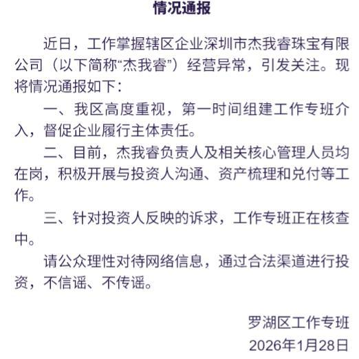 在广东省深圳市罗湖区水贝工业区,一家名为杰我睿珠宝有限公司的黄金预定价平台出现了兑付困难的问题。1月28日,罗湖区工作专班发布情况通报,指出该公司经营异常,引起了广泛关注。
