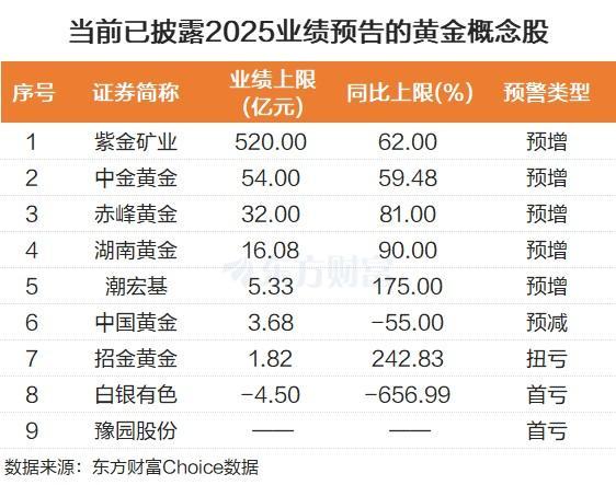 黄金概念股业绩预告亮眼。东方财富Choice数据显示,已有9只黄金概念股披露2025年业绩预告,其中5只业绩预增,1只扭亏。紫金矿业预计2025年归母净利润最高可达520亿元,同比增长62%。中金黄金、赤峰黄金和湖南黄金归母净利润上限也超过10亿元。潮宏基和招金黄金业绩同比上限预计翻倍。