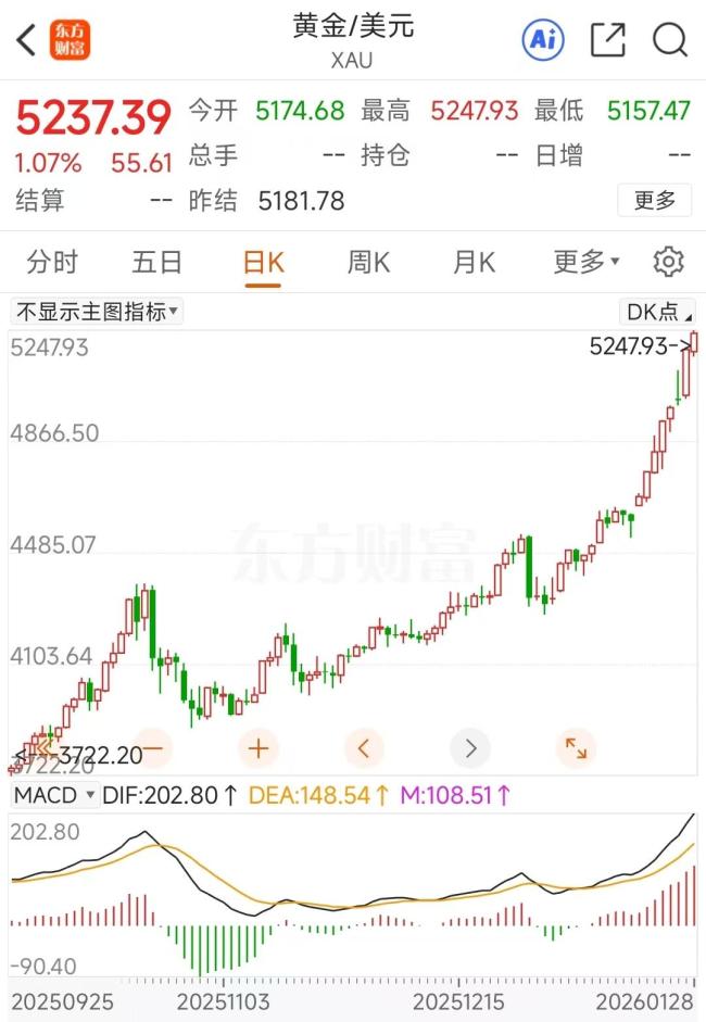 国际金价近期涨势惊人。1月28日,现货黄金一度突破5200美元,逼近5250美元。而2025年最后一个交易日,现货黄金报收4310.89美元。这意味着,2026年开年不到一个月时间,现货黄金已大涨超过900美元。