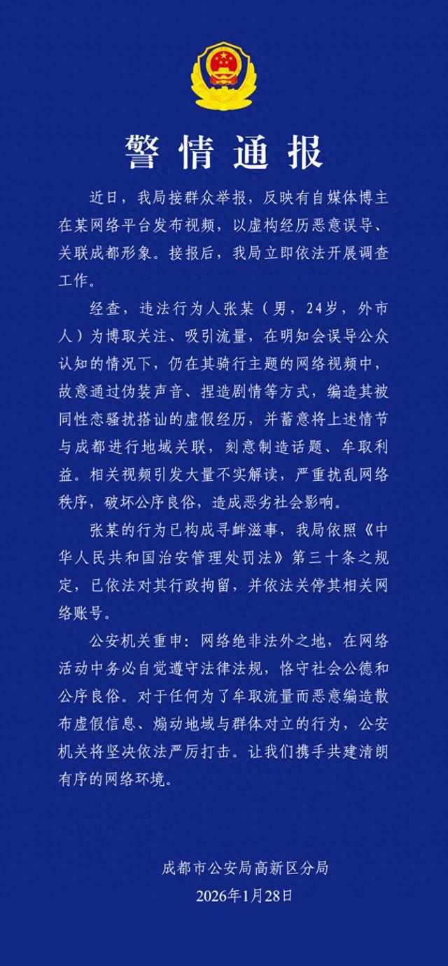 1月28日,成都市公安局高新区分局发布警情通报。近日,该局接到群众举报,反映有自媒体博主在某网络平台发布视频,以虚构经历恶意误导、关联成都形象。接报后,警方立即依法开展调查工作。