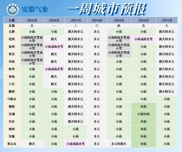 具体预报如下:25日白天全省阴天,江淮之间大部分地区有小雨。夜间全省依旧阴天,江北和江南部分地区有小雨,淮河以北部分地区转为雨夹雪或小雪。26日全省阴天,淮河以北东部出现雨夹雪,淮河以南大部分地区则有小雨。27日江北转为多云,江南仍保持阴天并伴有小雨,山区有雨夹雪或小雪。28日全省天气转好,呈现多云状态。29日全省再次转为阴天,江北和江南部分地区有小雨,淮河以北部分地区有小雨转雨夹雪或小雪。到了30日,全省阴天伴有小雨,江南地区降雨量较大,夜间大别山区可能出现小雨转雨夹雪或小雪。最后,31日江北天气好转,转为多云;沿江江南地区则为阴天到多云,并伴有小雨,山区局部可能有雨夹雪或小雪。黄淮江淮局地降温将超10℃雨雪天气来袭!