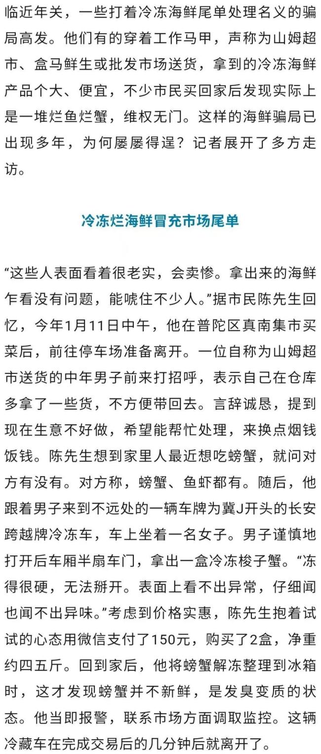 监控显示,市民陈先生在真南集市被售卖假海鲜的人员带到冷藏车附近。就在陈先生受骗的前一天,有市民同样在真南集市停车场遭遇了一对中年男女搭讪。他们声称市场送货后剩下几件海鲜尾单,可以便宜处理。该市民花800元买了黄鱼、鲳鱼和虾后发现无法食用,联系商贩微信时发现自己已被拉黑。解冻后,陈先生发现梭子蟹发臭。