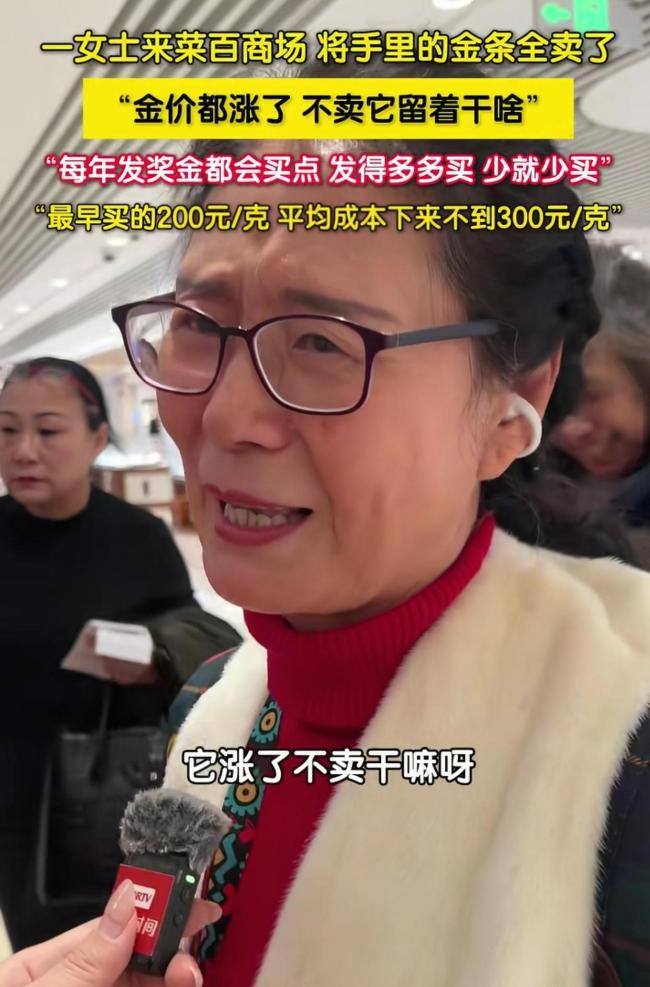 这位阿姨的每根金条都记录着时间的痕迹。2008年金融危机时,她用年终奖买了第一根,那时金价刚过200元/克。2013年金价达到300元/克时,她又添了两块。2020年疫情期间,金价飙升至400元/克,她依然继续购买。13年间,她像存定期一样买金条,从不借钱或加杠杆,连孩子的学费都有专门的储备。