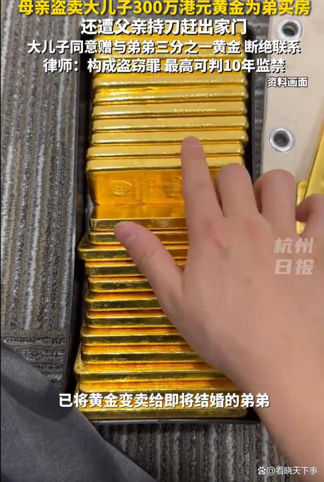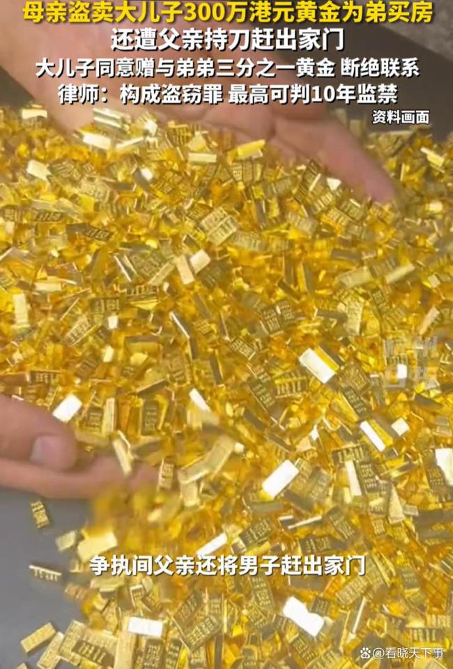 母亲盗卖长子黄金给幼子买房 亲情何价?香港一名男子郑先生发现他多年积攒的价值300万元的黄金不翼而飞。起初,他以为是外人所为,但经过一番调查后,他惊讶地发现,盗走黄金的人竟是自己的母亲。原来,母亲为了给小儿子买房结婚,偷偷将大儿子的黄金变卖,用所得的钱支付了首付。