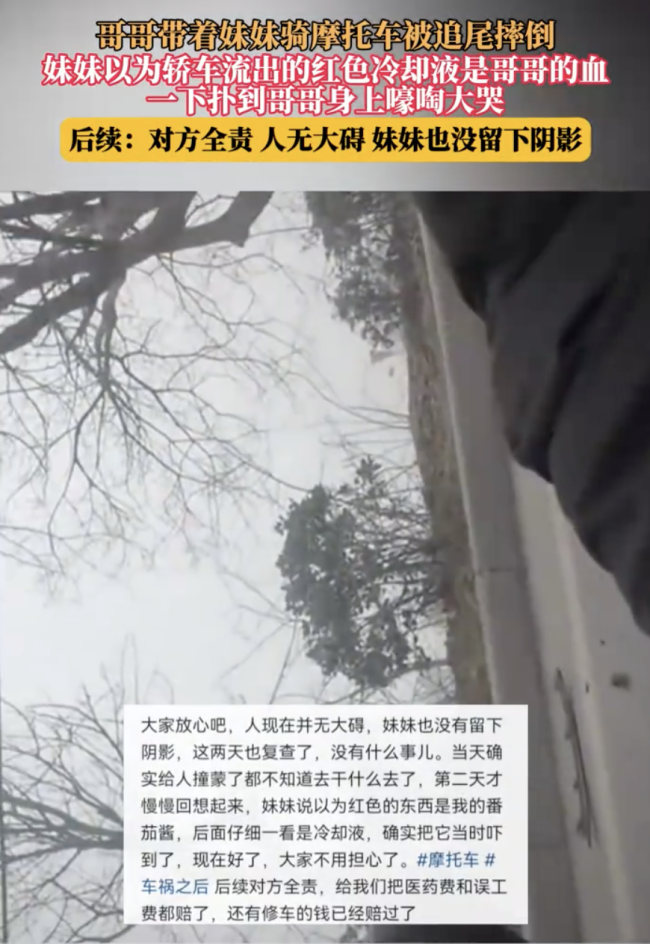 出车祸后妹妹误以为冷却液是血大哭谣言引发共情浪潮!近日,陕西一对兄妹骑摩托车时遭遇追尾事故,妹妹误将轿车泄漏的红色冷却液当作哥哥的血,扑到其身上嚎啕大哭。