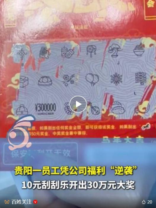 公司发10元刮刮乐员工中30万 新年开门红直接拉满!2月10日,贵阳一家公司以面值10元的刮刮乐作为开单奖励。一位员工随手一刮,竟幸运地中了30万元大奖。